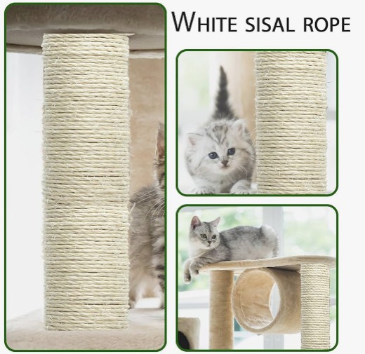 4. Svestranost: Sisalni stupovi imaju različite primjene u dizajnu stabla mačaka. Mogu se koristiti kao potporne strukture za penjanje i grebanje, a mogu se koristiti i za izradu materijala za punjenje za mačja gnijezda i mačje krevete. Mekoća i prozračnost sisalnih vlakana pružaju mačkama ugodno i zdravo okruženje za odmaranje, poboljšavajući njihovo iskustvo upotrebe i zadovoljstvo.