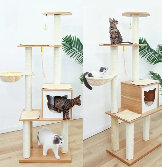 | Lijepa i ugodna | Prirodna tekstura i boja ekološki prihvatljivog drva dodaju toplu i prirodnu atmosferu okviru penjanja stana za mačje stabla, pružajući toplo i ugodno okruženje za odmaranje mačkama |